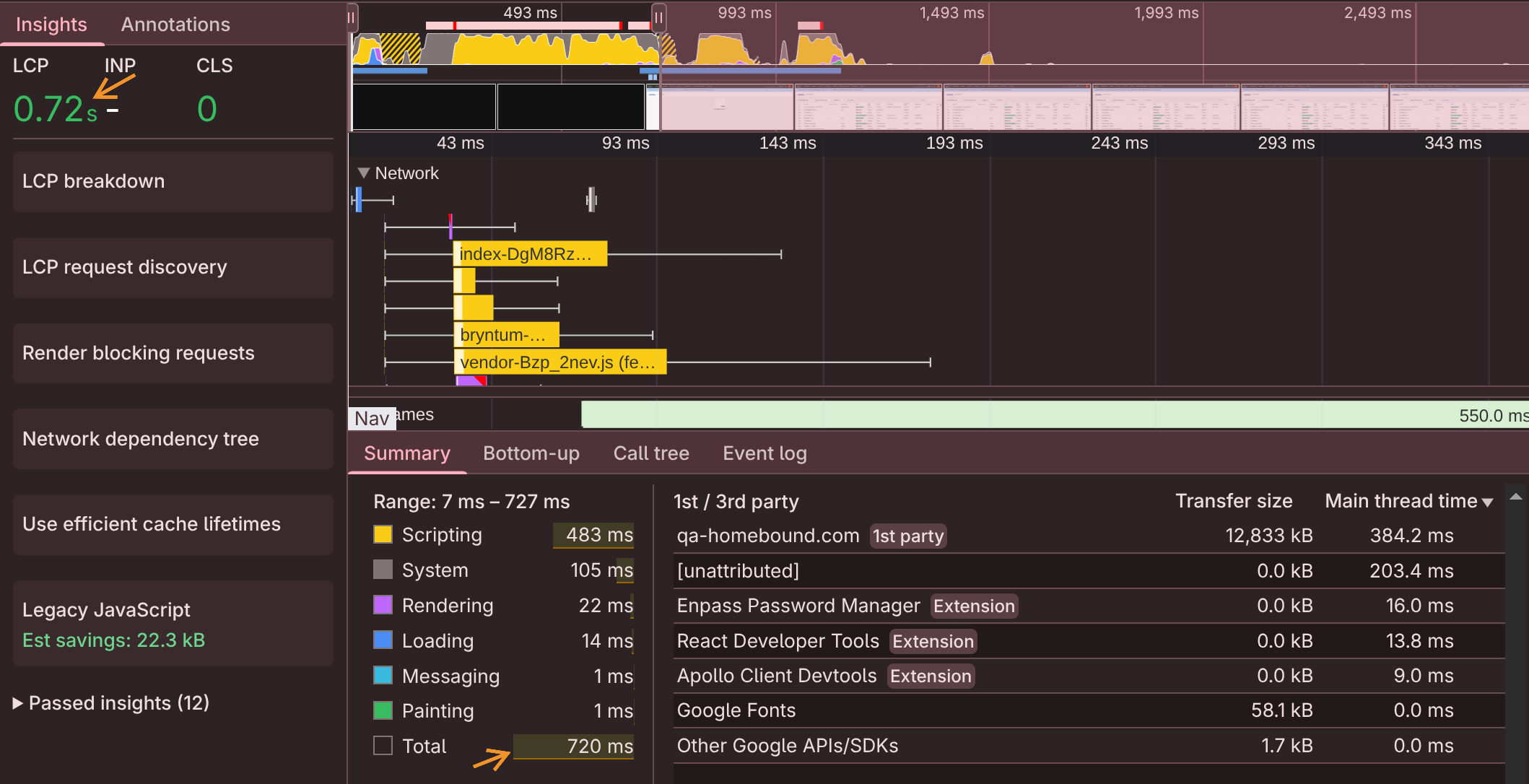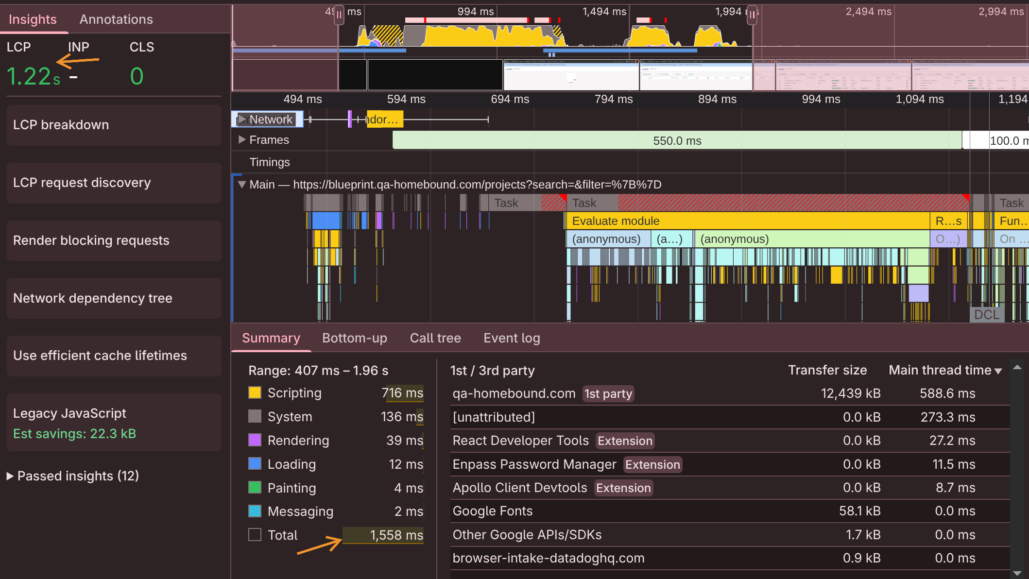 Here is Chromeâs Performance tab results for simple dashboard page of our app, before the LCP was 1.2s and 1,500ms spent in JavaScript: